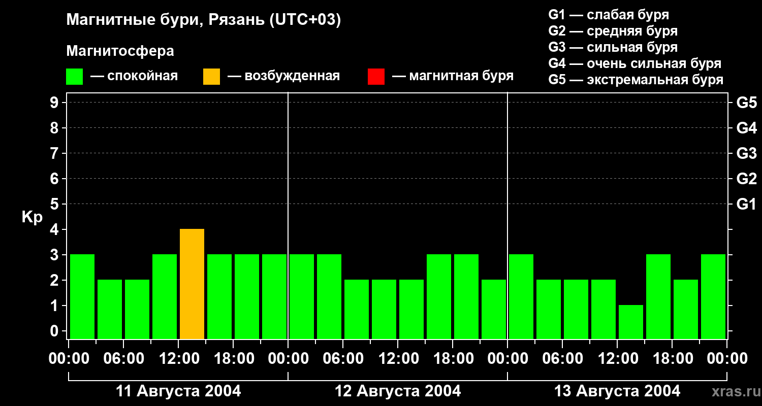 Изменения геомагнитного индекса Kp с 11 по 13 августа 2004 года для средних широт