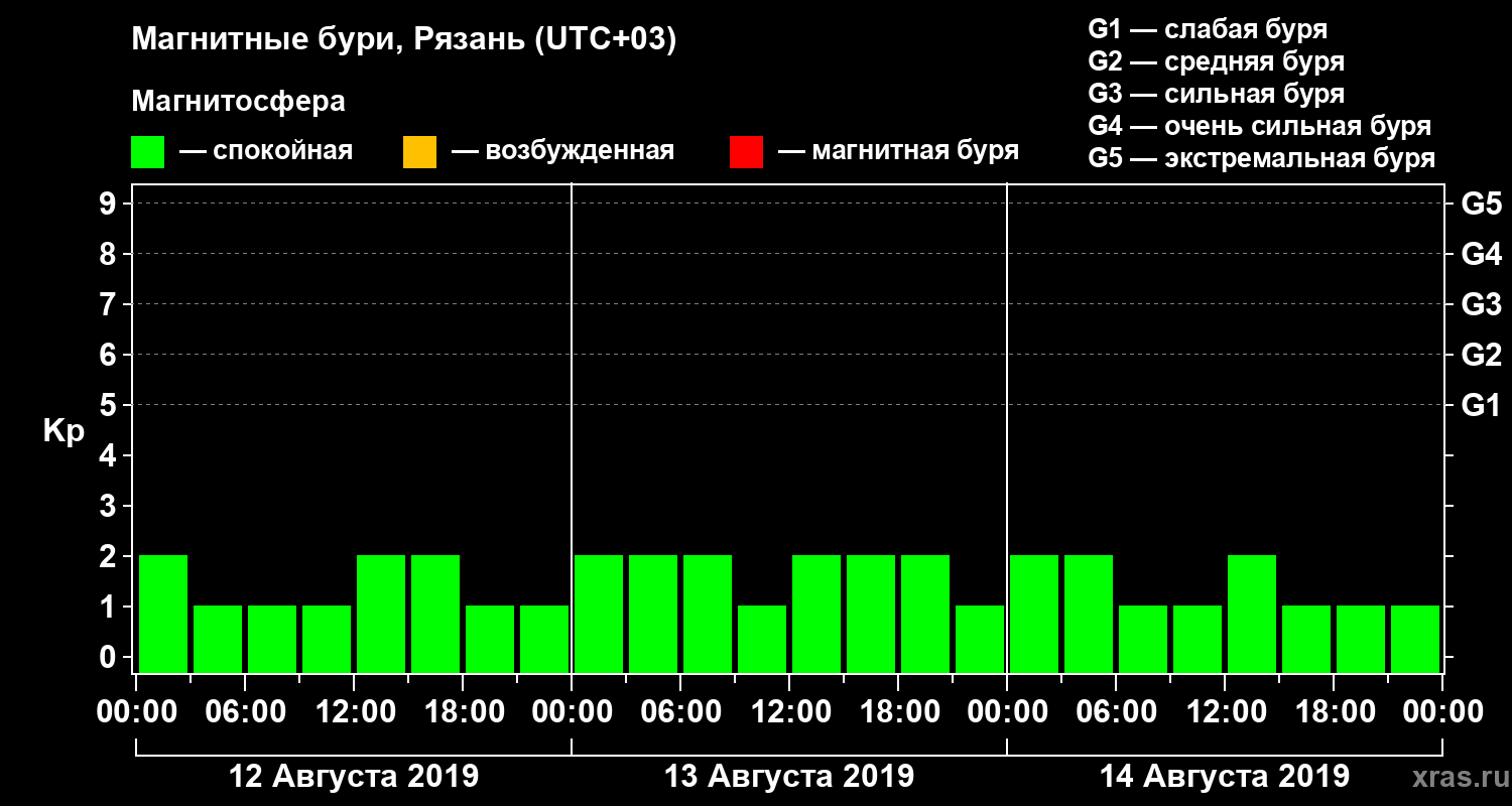 Изменения геомагнитного индекса Kp с 12 по 14 августа 2019 года для средних широт
