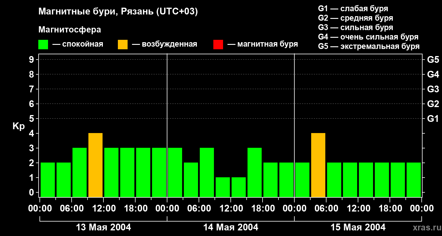 Изменения геомагнитного индекса Kp с 13 по 15 мая 2004 года для средних широт
