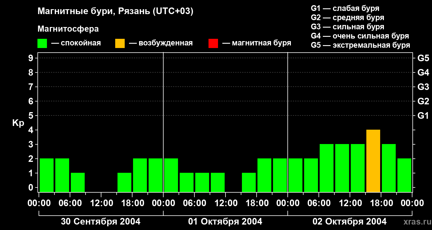 Изменения геомагнитного индекса Kp с 30 сентября по 2 октября 2004 года для средних широт
