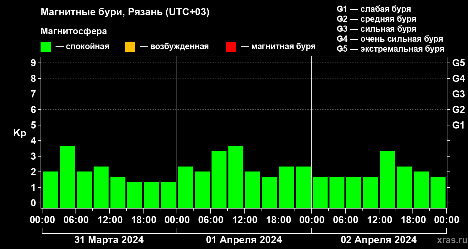 Изменения геомагнитного индекса Kp с 31 марта по 2 апреля 2024 года для средних широт