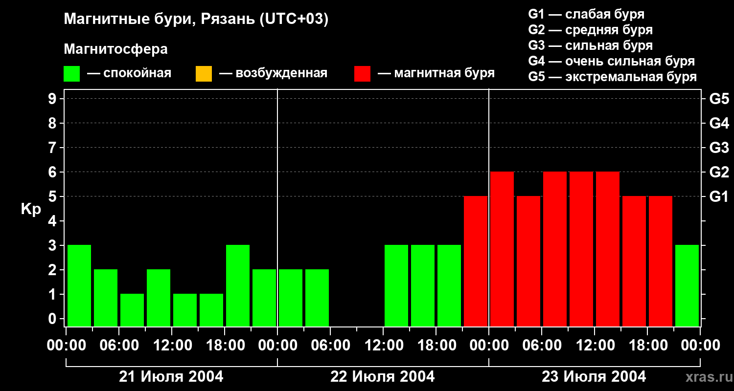 Изменения геомагнитного индекса Kp с 21 по 23 июля 2004 года для средних широт