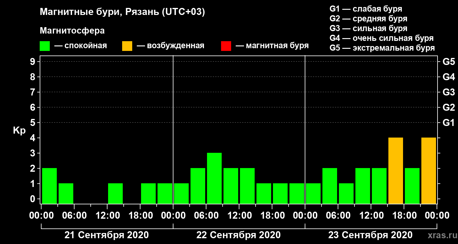Изменения геомагнитного индекса Kp с 21 по 23 сентября 2020 года для средних широт