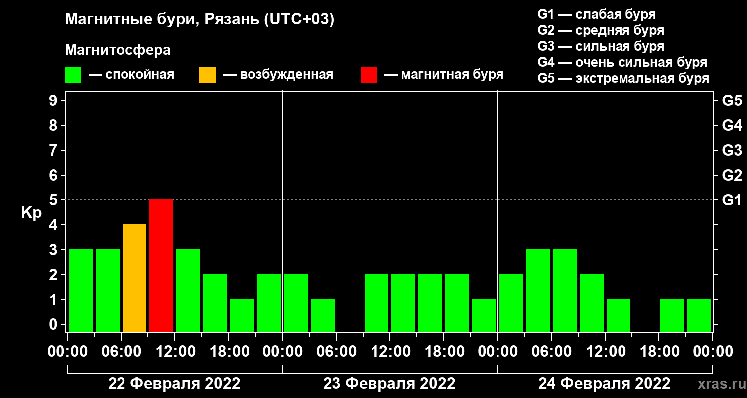 Изменения геомагнитного индекса Kp с 22 по 24 февраля 2022 года для средних широт