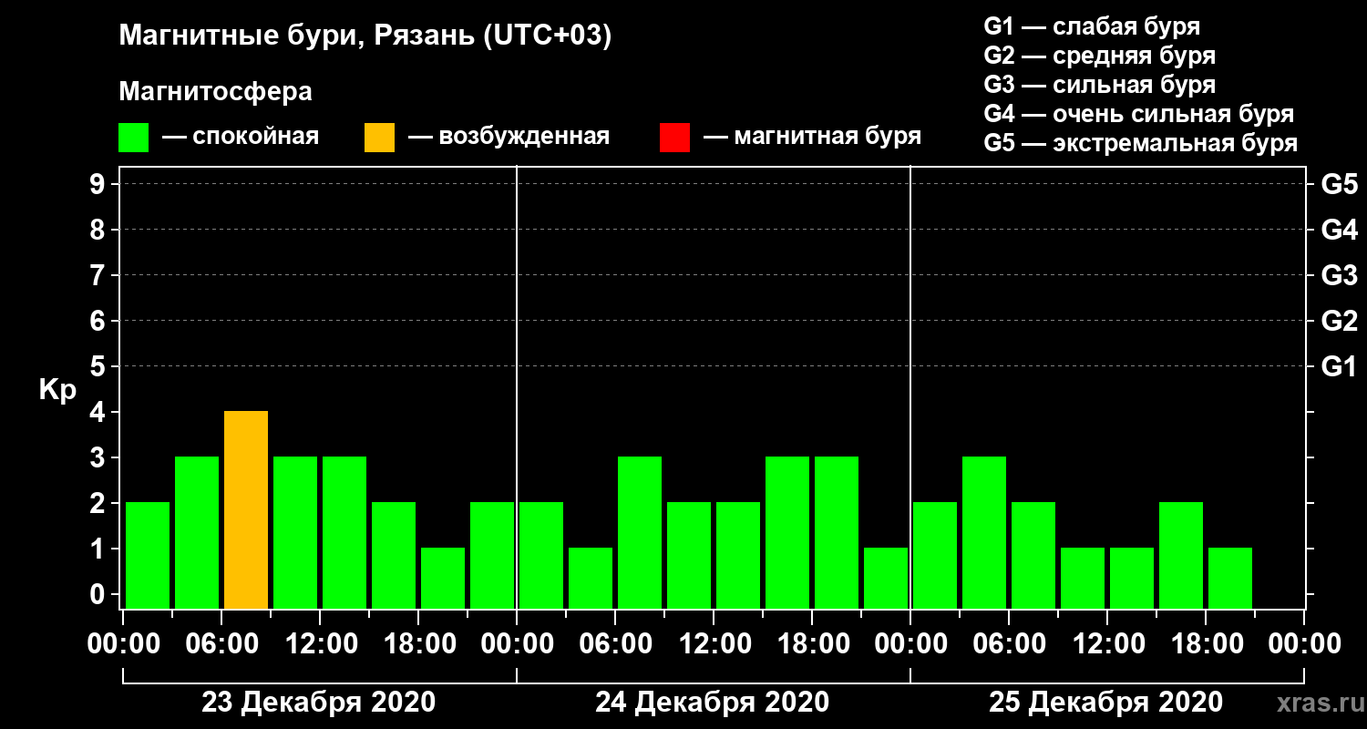 Изменения геомагнитного индекса Kp с 23 по 25 декабря 2020 года для средних широт