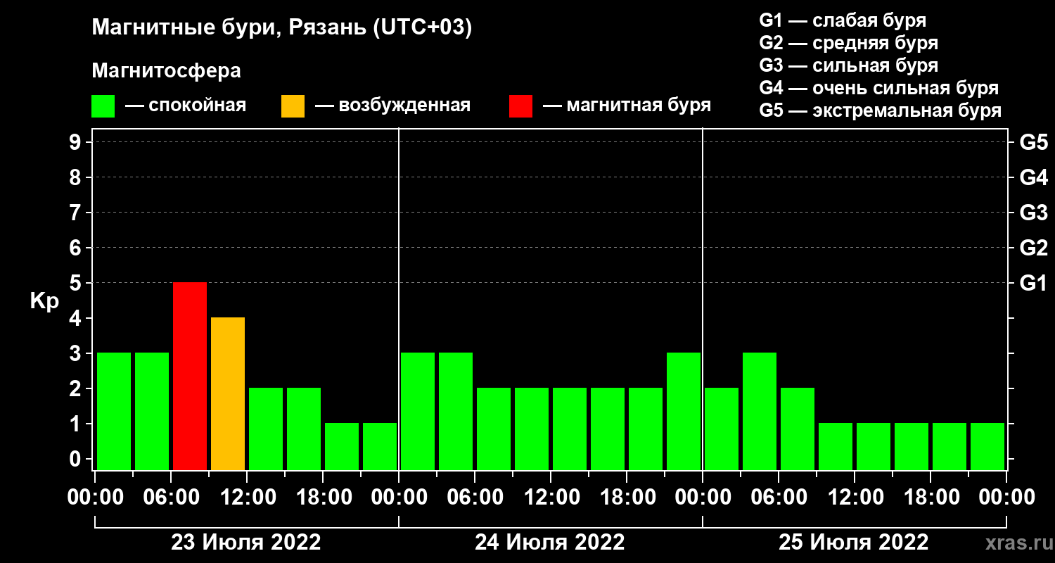 Изменения геомагнитного индекса Kp с 23 по 25 июля 2022 года для средних широт
