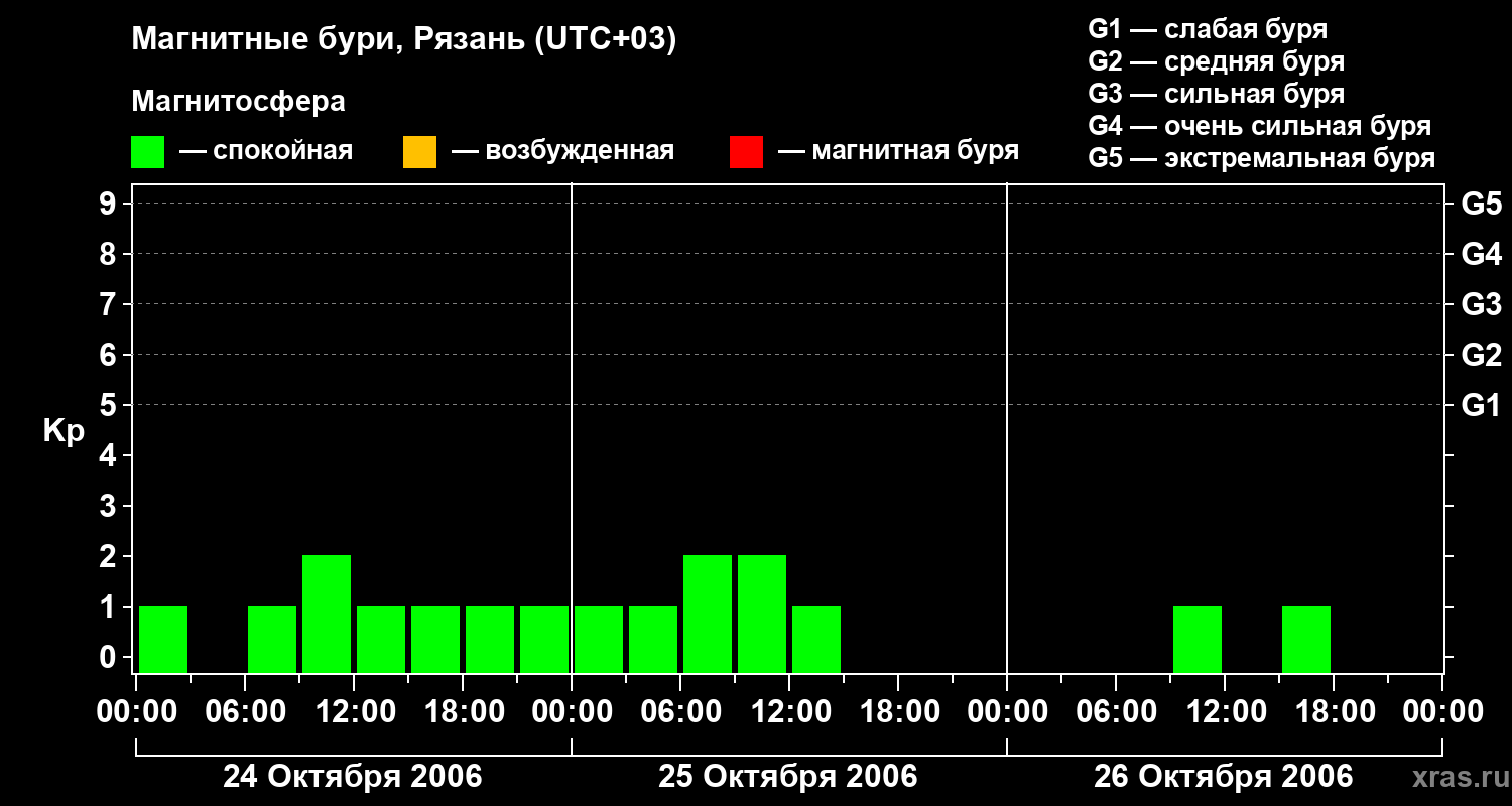 Изменения геомагнитного индекса Kp с 24 по 26 октября 2006 года для средних широт