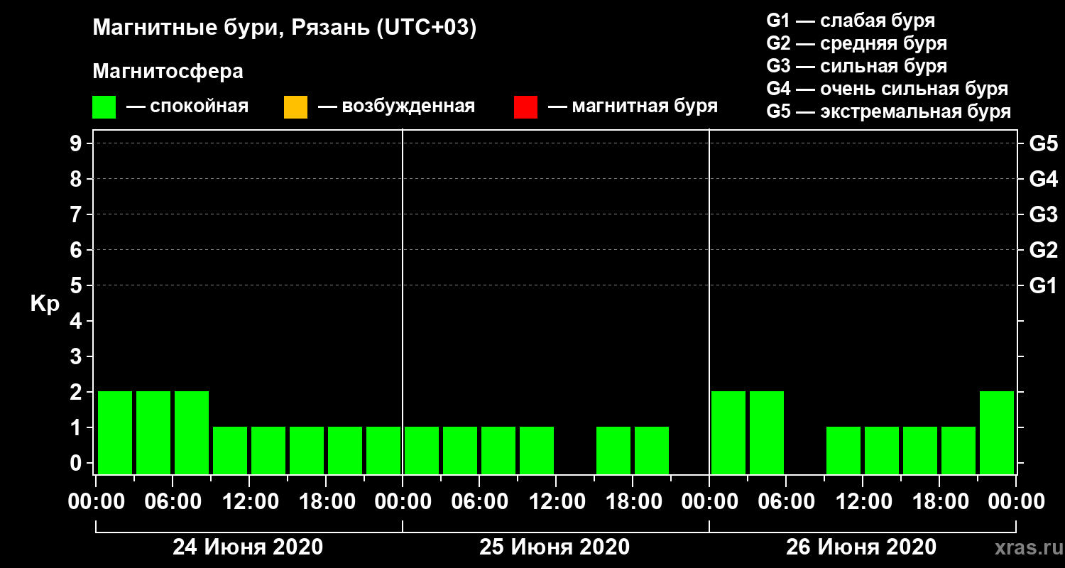 Изменения геомагнитного индекса Kp с 24 по 26 июня 2020 года для средних широт