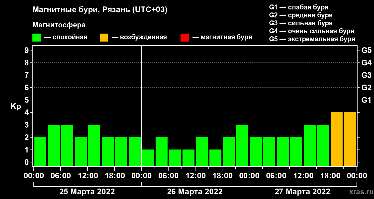 Изменения геомагнитного индекса Kp с 25 по 27 марта 2022 года для средних широт