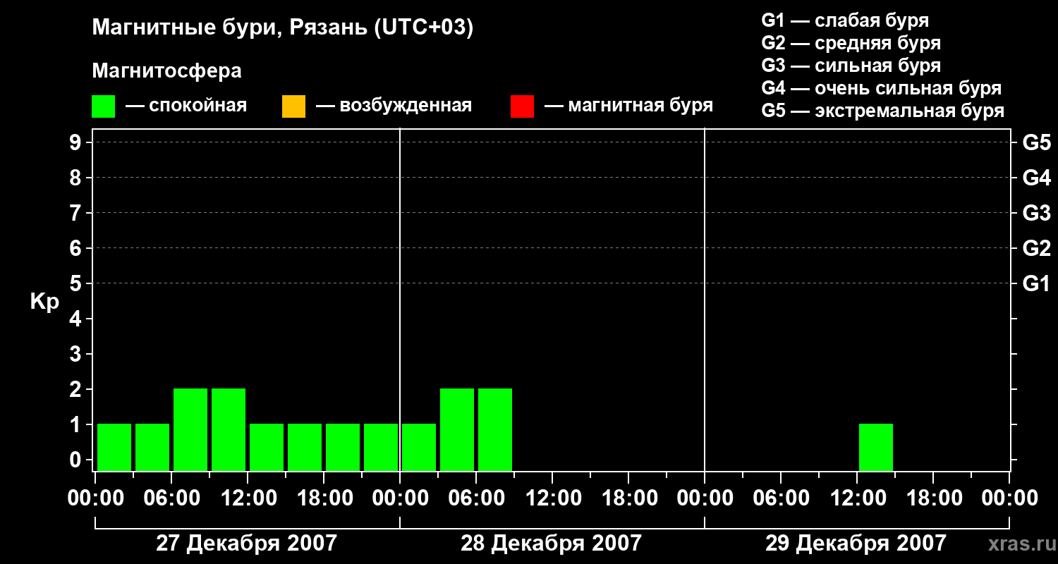 Изменения геомагнитного индекса Kp с 27 по 29 декабря 2007 года для средних широт