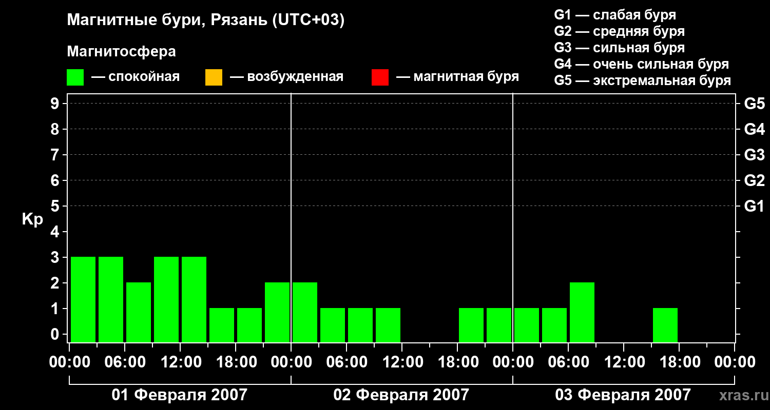 Изменения геомагнитного индекса Kp с 1 по 3 февраля 2007 года для средних широт
