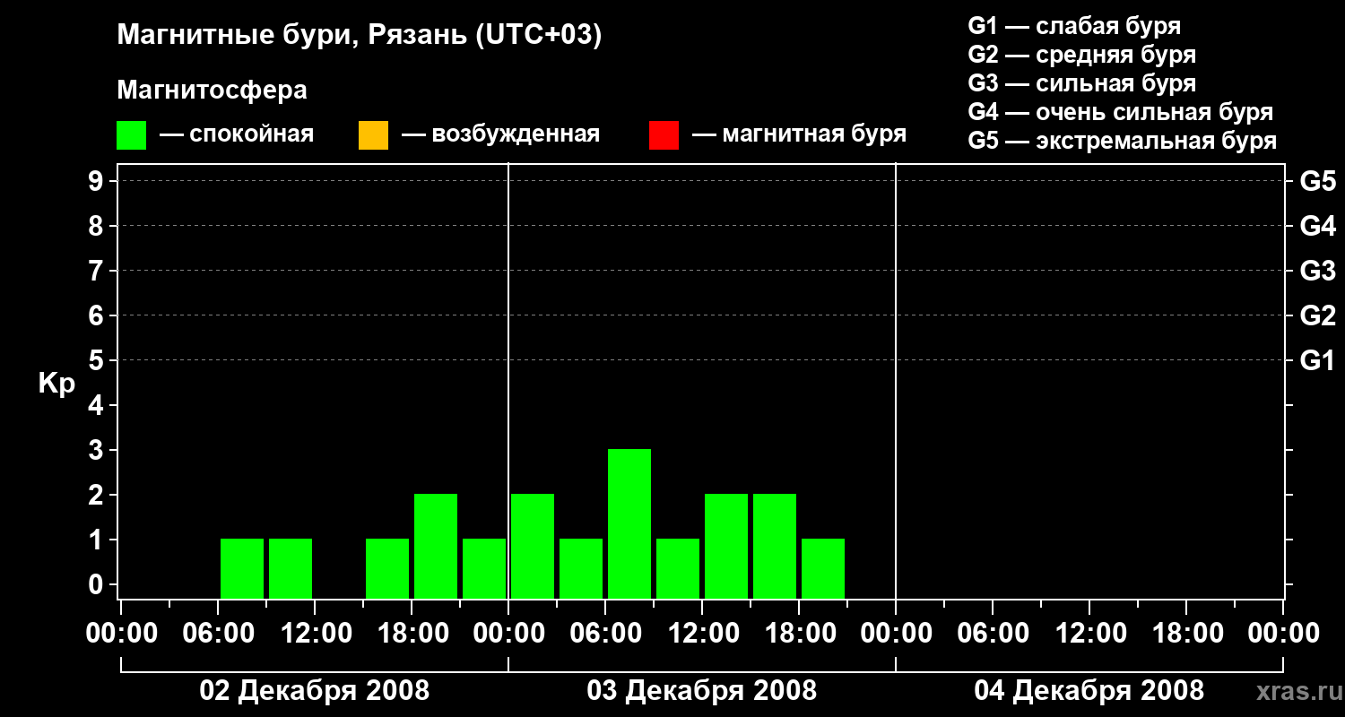 Изменения геомагнитного индекса Kp с 2 по 4 декабря 2008 года для средних широт