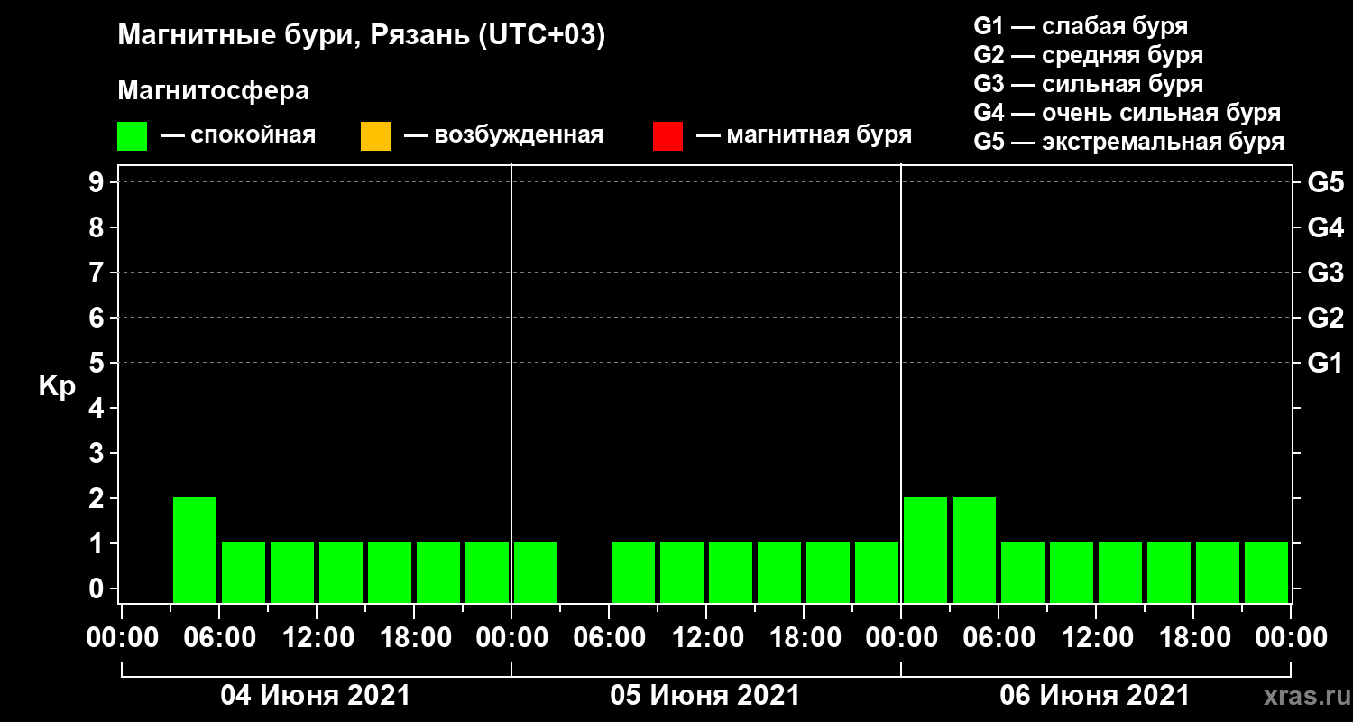 Изменения геомагнитного индекса Kp с 4 по 6 июня 2021 года для средних широт