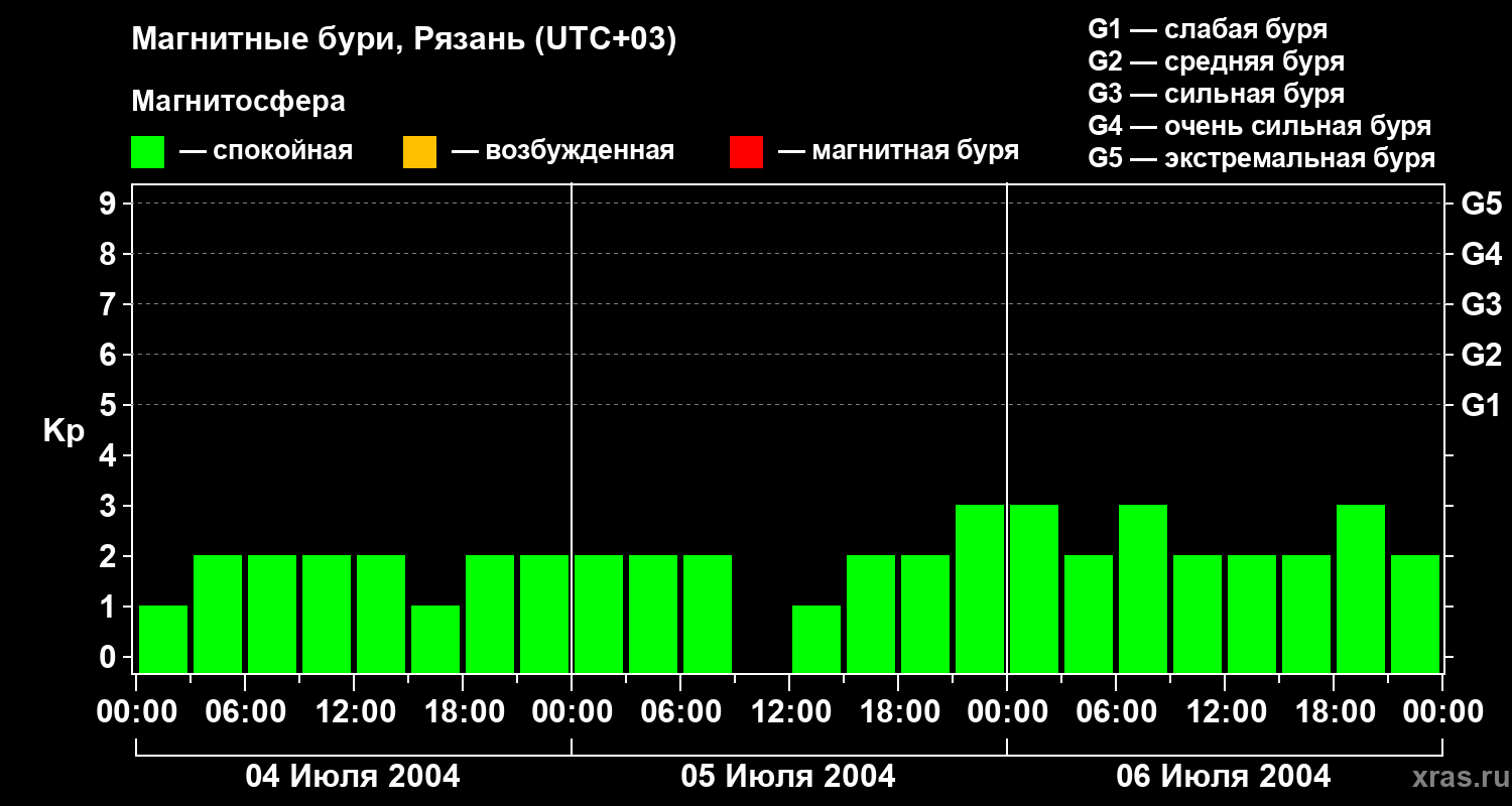 Изменения геомагнитного индекса Kp с 4 по 6 июля 2004 года для средних широт