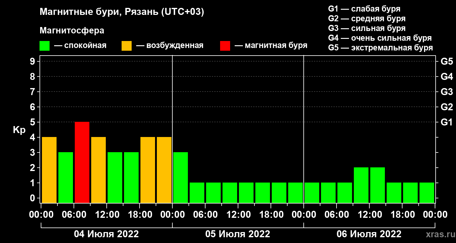 Изменения геомагнитного индекса Kp с 4 по 6 июля 2022 года для средних широт