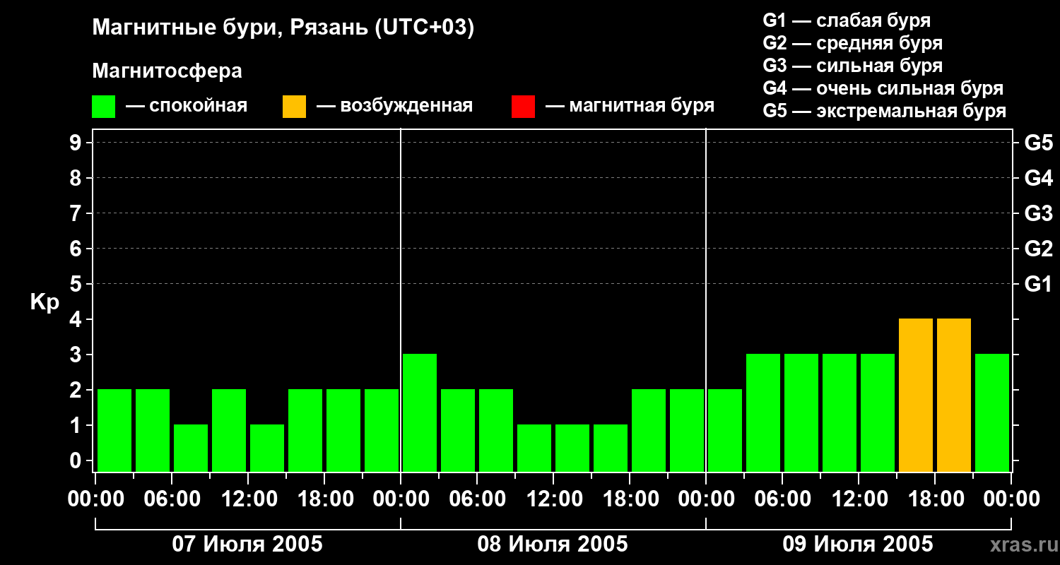 Изменения геомагнитного индекса Kp с 7 по 9 июля 2005 года для средних широт