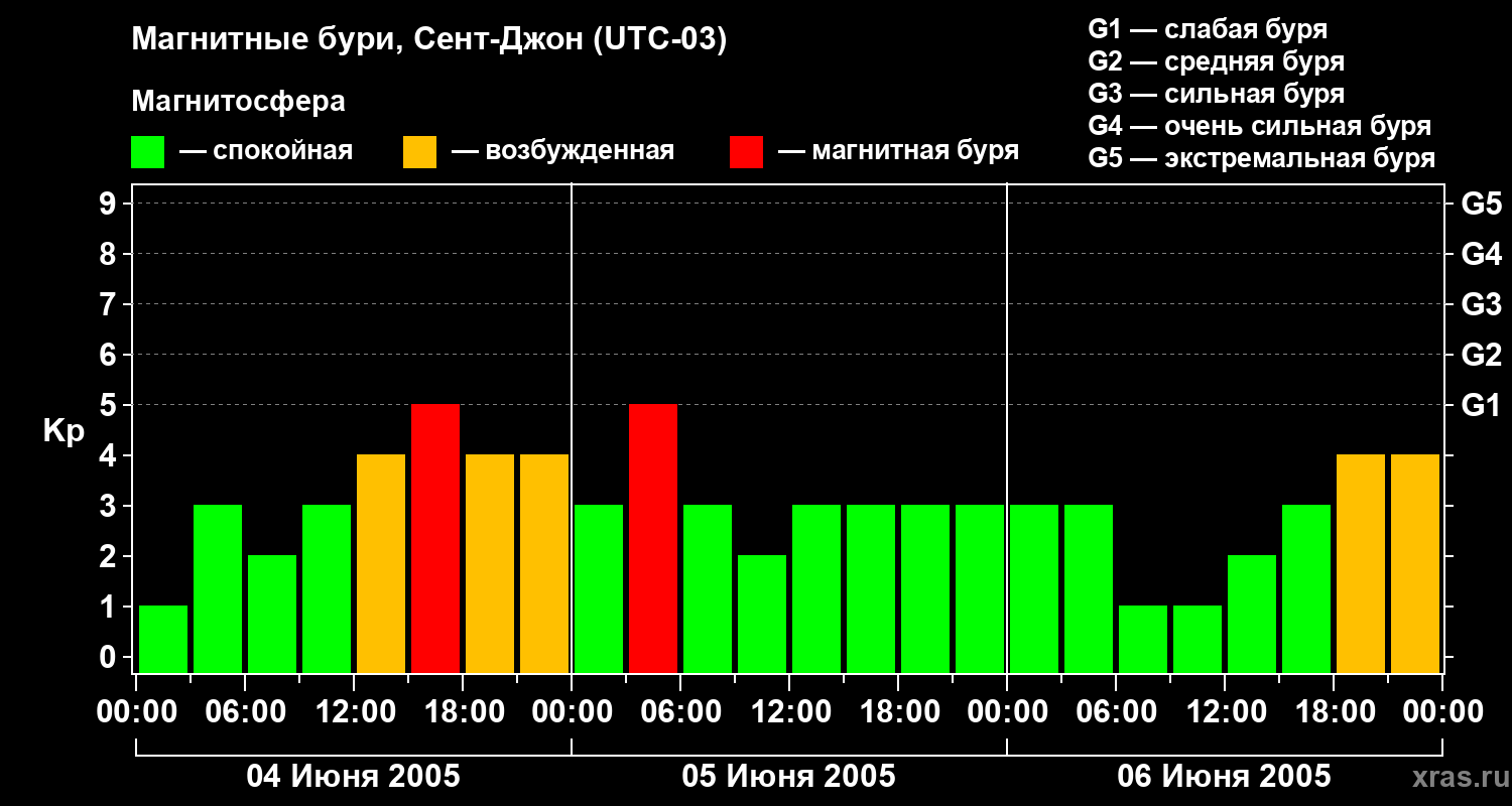 Изменения геомагнитного индекса Kp с 4 по 6 июня 2005 года для средних широт
