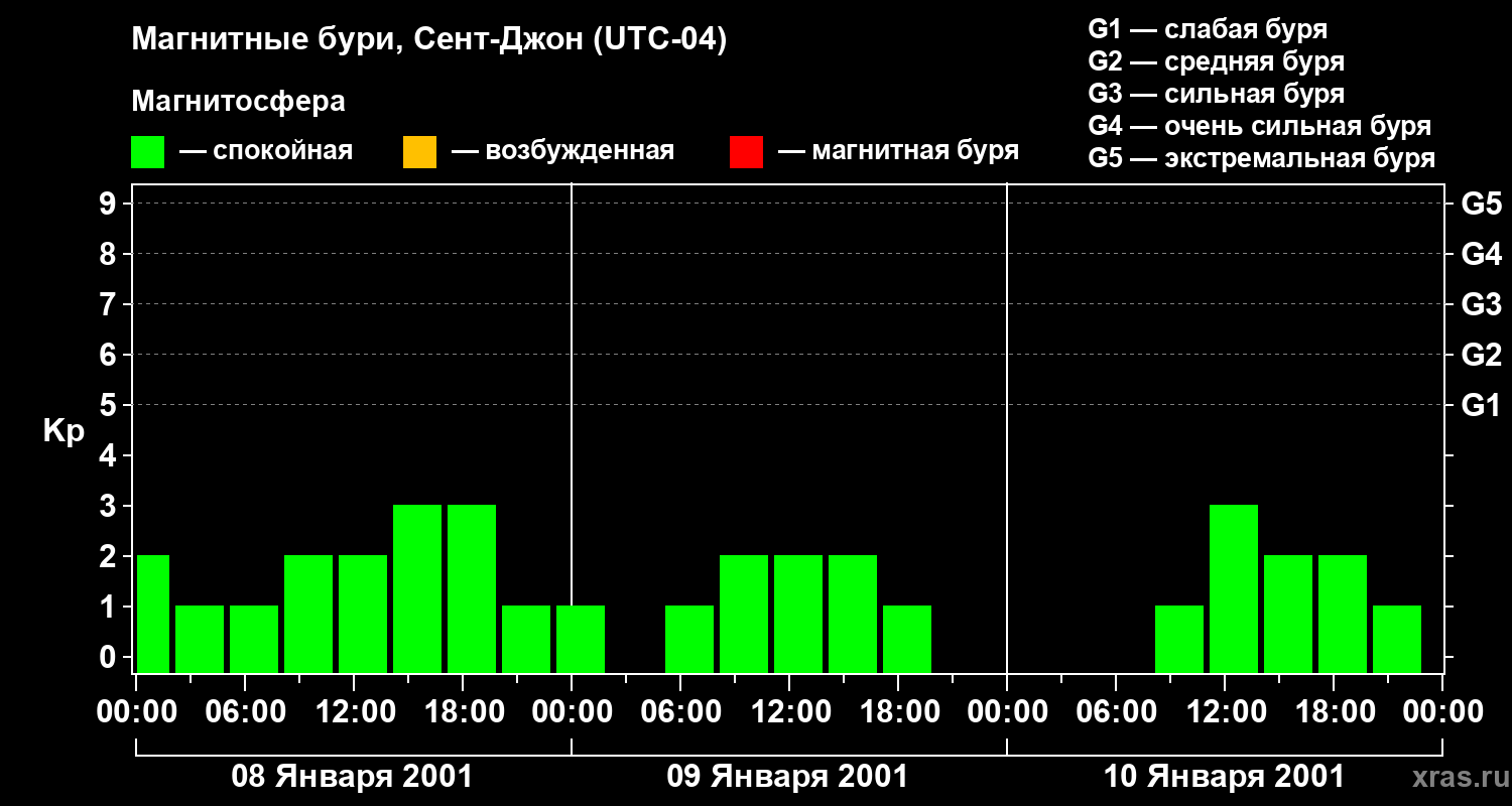 Изменения геомагнитного индекса Kp с 8 по 10 января 2001 года для средних широт
