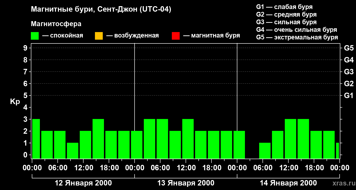Изменения геомагнитного индекса Kp с 12 по 14 января 2000 года для средних широт