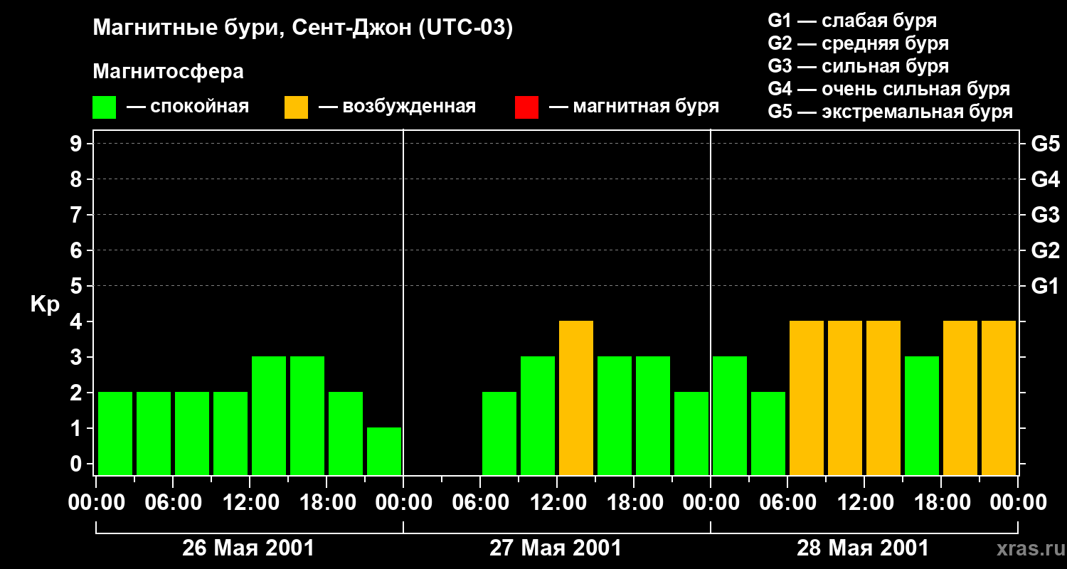 Изменения геомагнитного индекса Kp с 26 по 28 мая 2001 года для средних широт