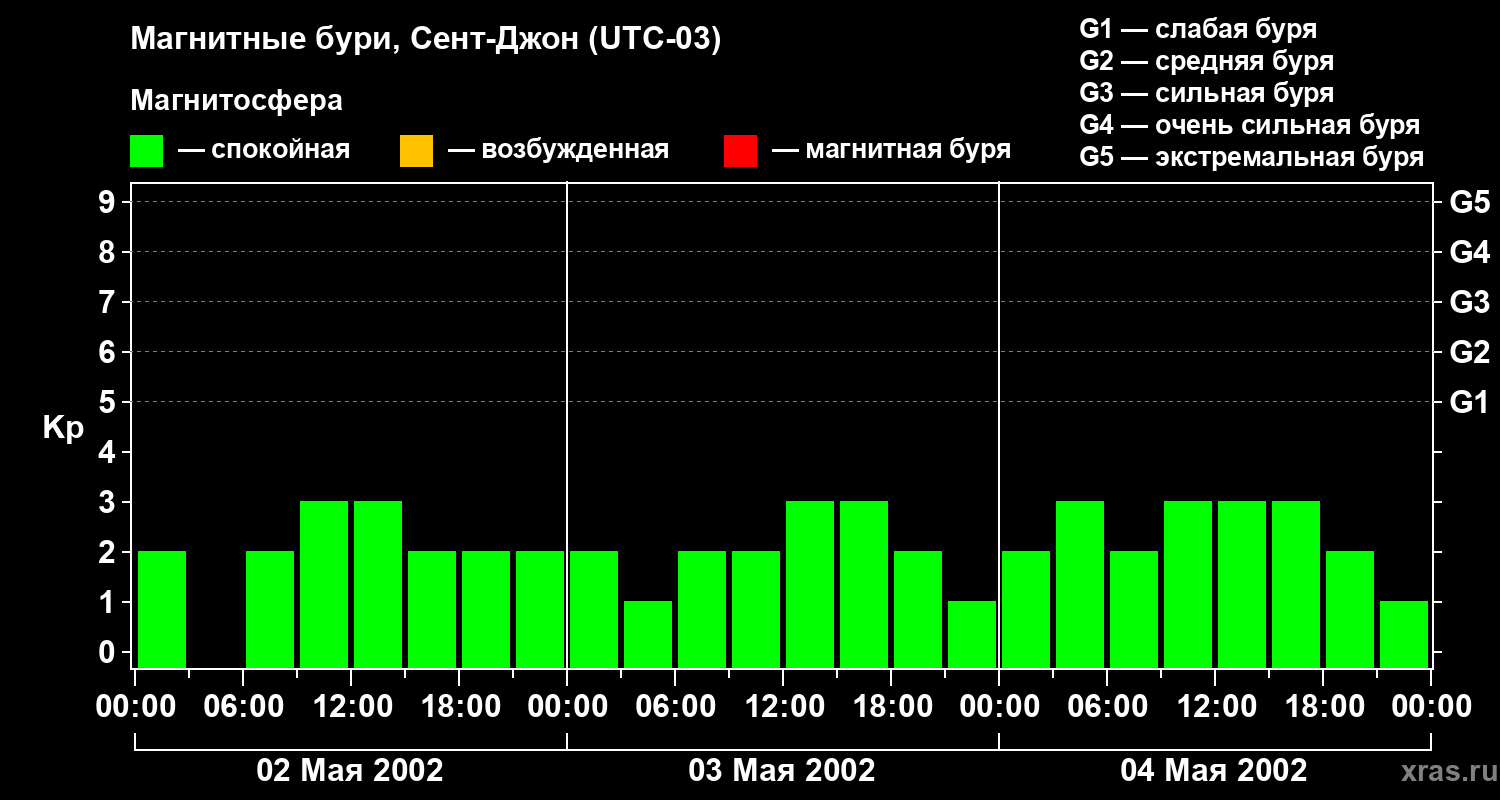 Изменения геомагнитного индекса Kp с 2 по 4 мая 2002 года для средних широт