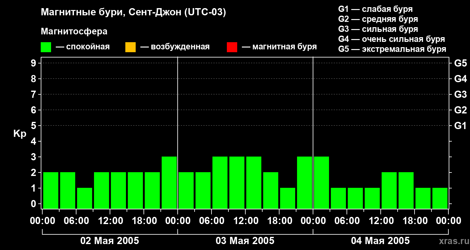 Изменения геомагнитного индекса Kp с 2 по 4 мая 2005 года для средних широт