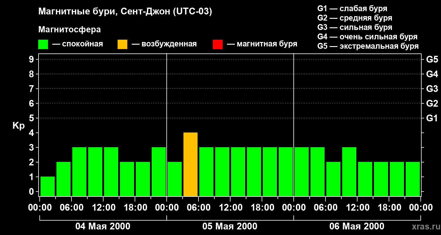 Изменения геомагнитного индекса Kp с 4 по 6 мая 2000 года для средних широт