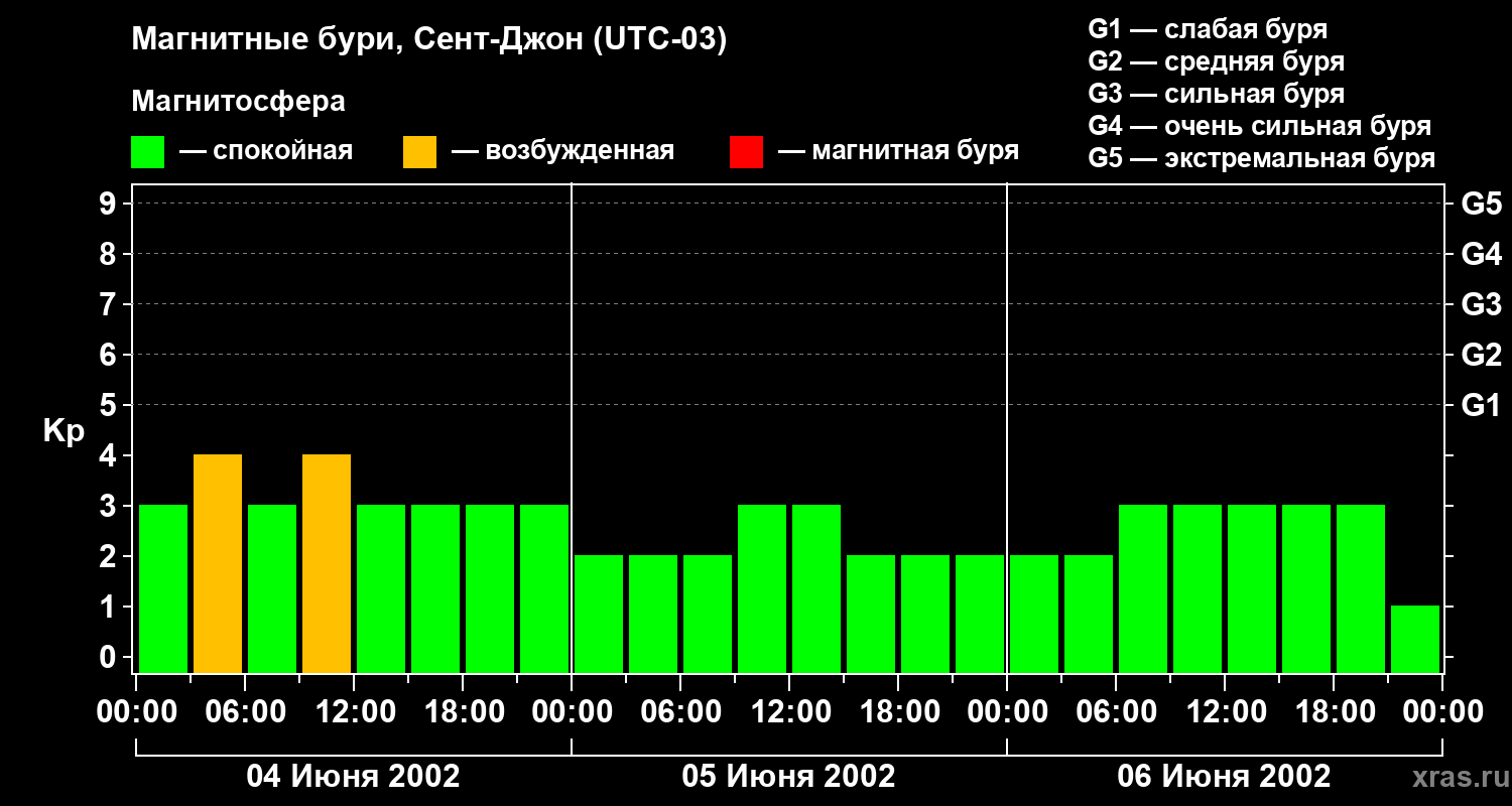 Изменения геомагнитного индекса Kp с 4 по 6 июня 2002 года для средних широт