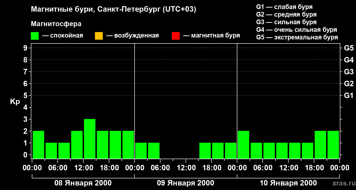 Изменения геомагнитного индекса Kp с 8 по 10 января 2000 года для средних широт