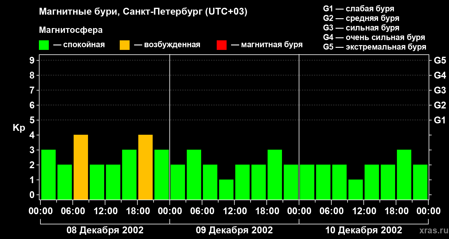 Изменения геомагнитного индекса Kp с 8 по 10 декабря 2002 года для средних широт