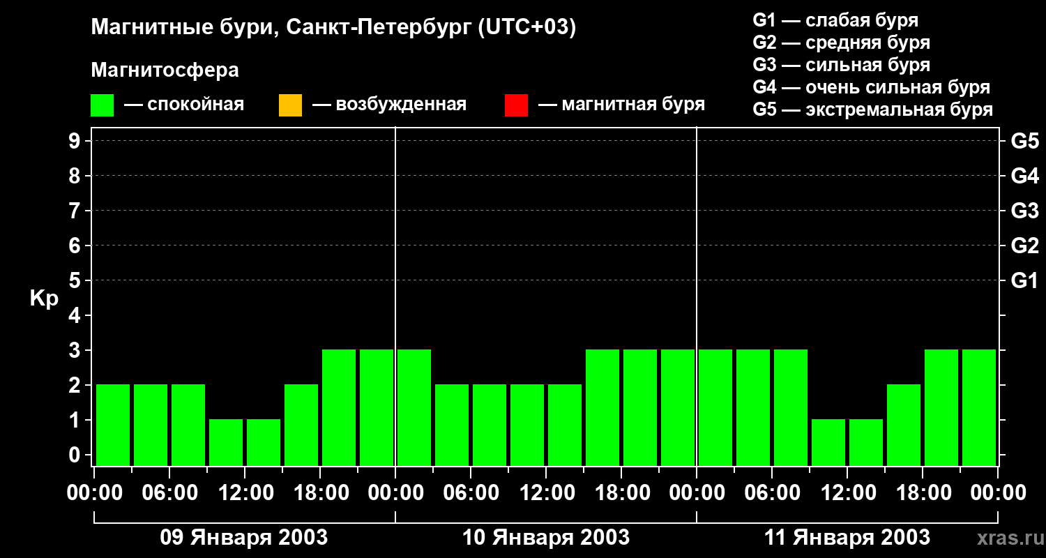 Изменения геомагнитного индекса Kp с 9 по 11 января 2003 года для средних широт