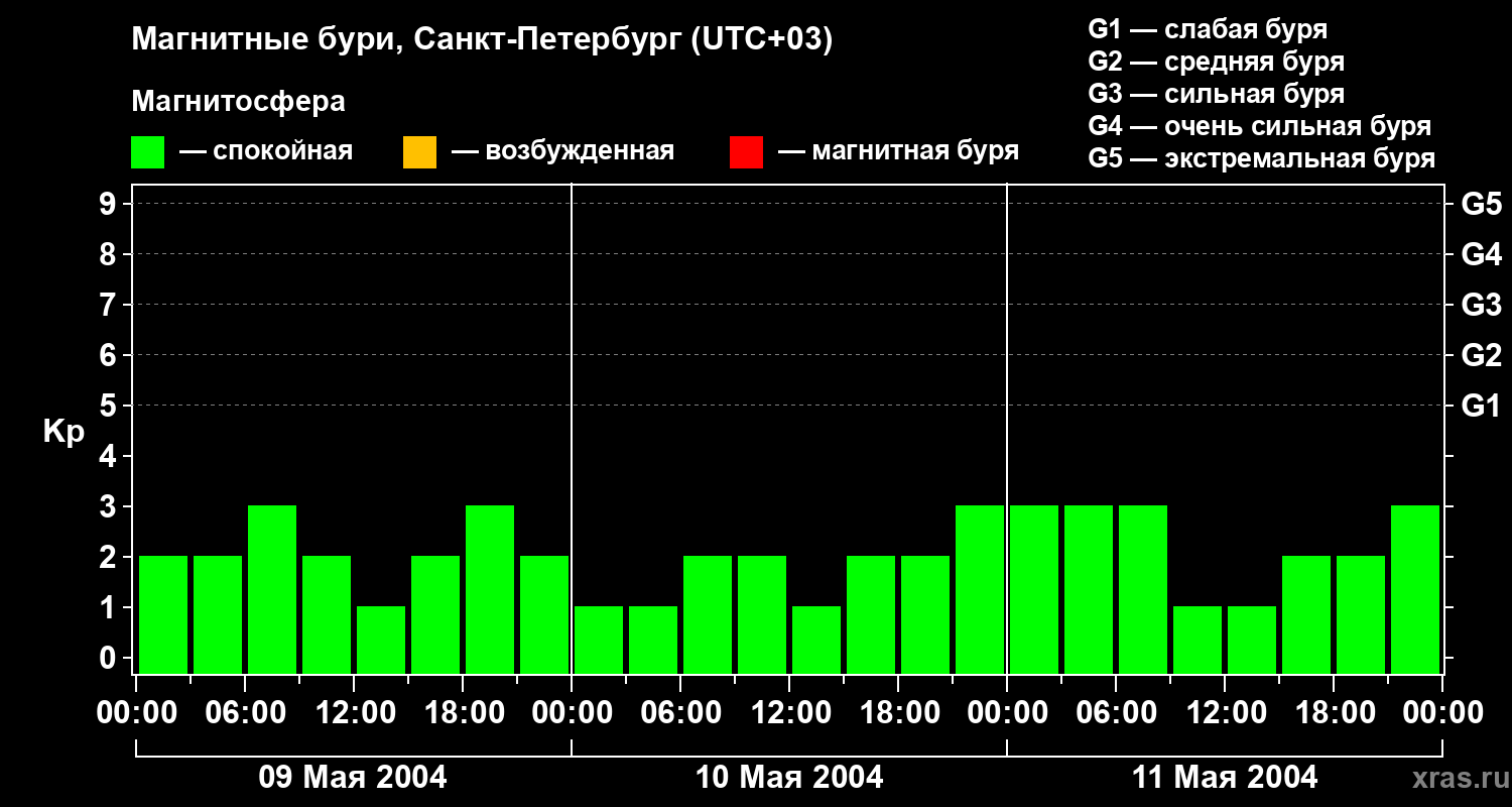 Изменения геомагнитного индекса Kp с 9 по 11 мая 2004 года для средних широт