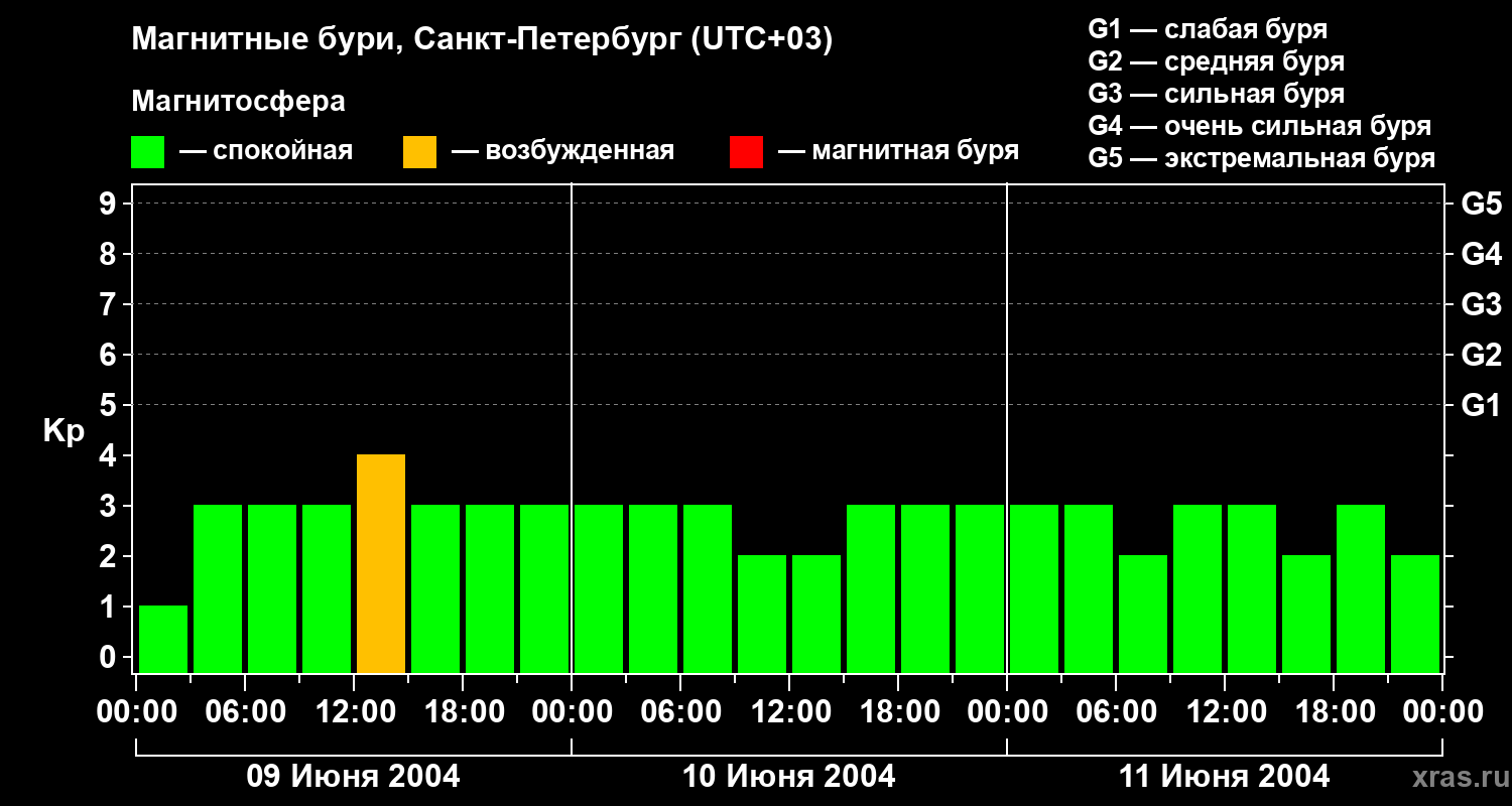 Изменения геомагнитного индекса Kp с 9 по 11 июня 2004 года для средних широт