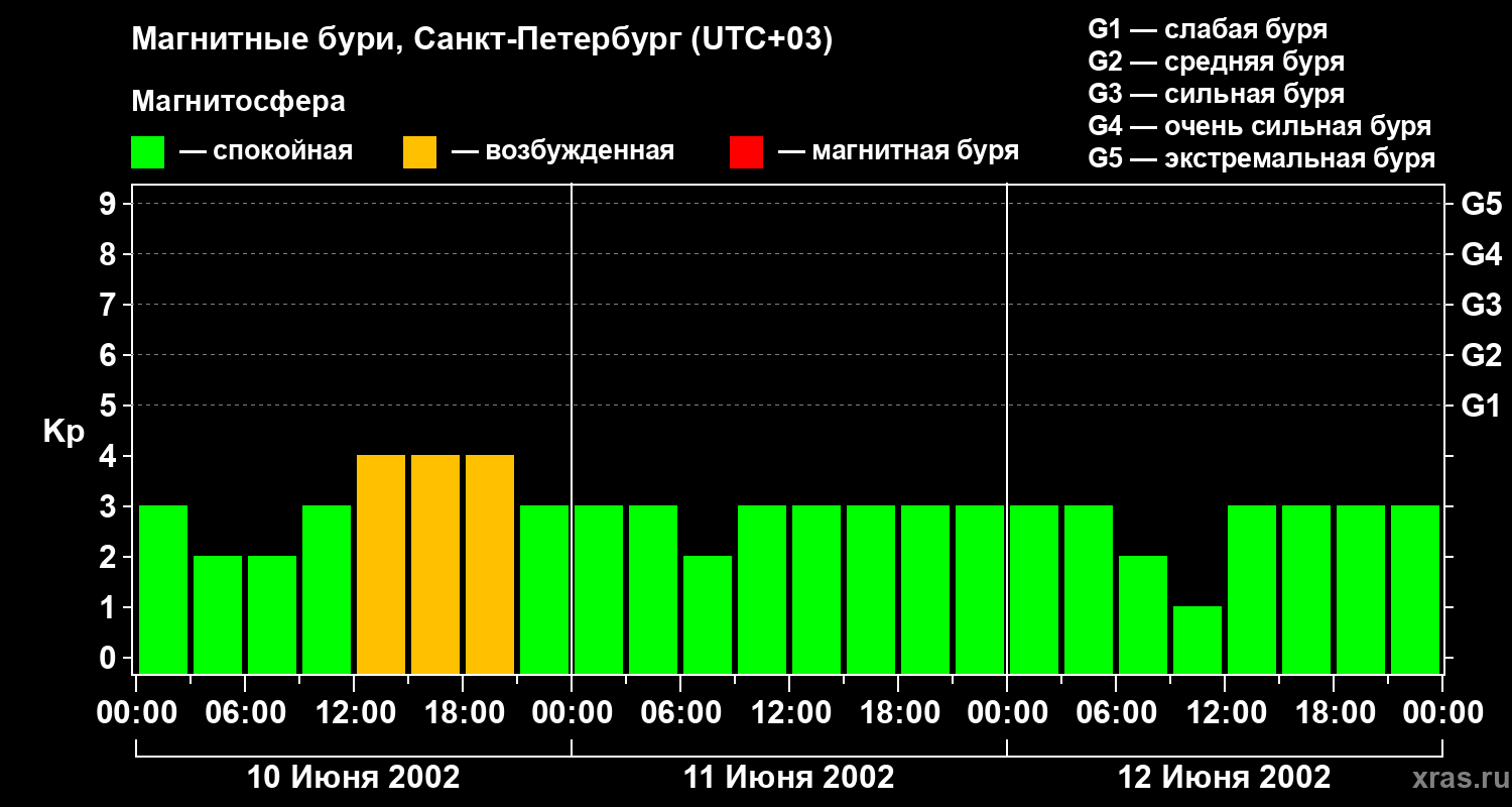Изменения геомагнитного индекса Kp с 10 по 12 июня 2002 года для средних широт