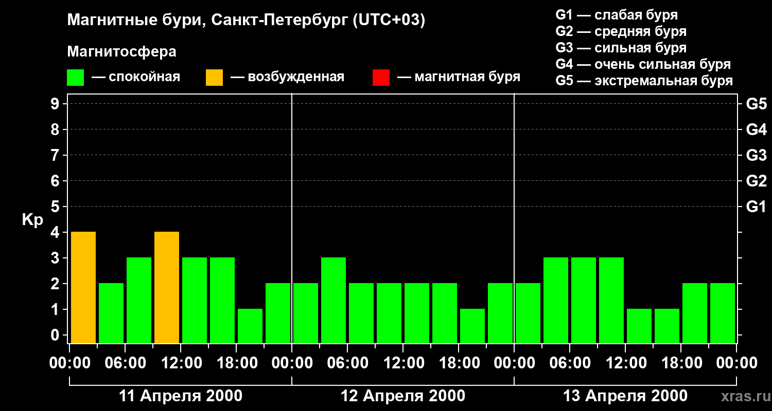 Изменения геомагнитного индекса Kp с 11 по 13 апреля 2000 года для средних широт