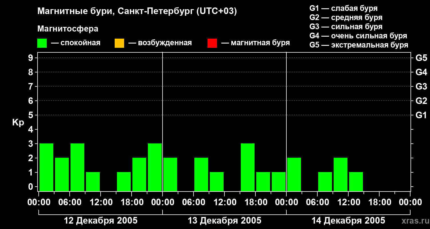 Изменения геомагнитного индекса Kp с 12 по 14 декабря 2005 года для средних широт