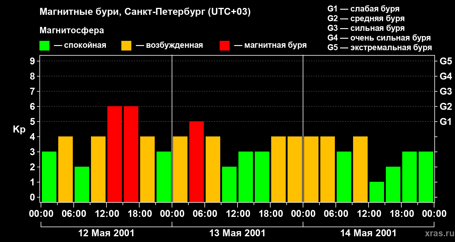 Изменения геомагнитного индекса Kp с 12 по 14 мая 2001 года для средних широт
