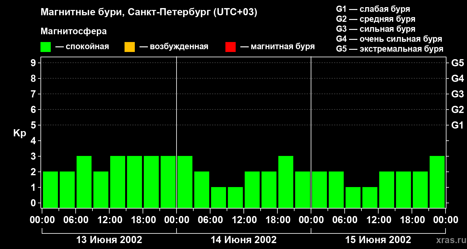 Изменения геомагнитного индекса Kp с 13 по 15 июня 2002 года для средних широт