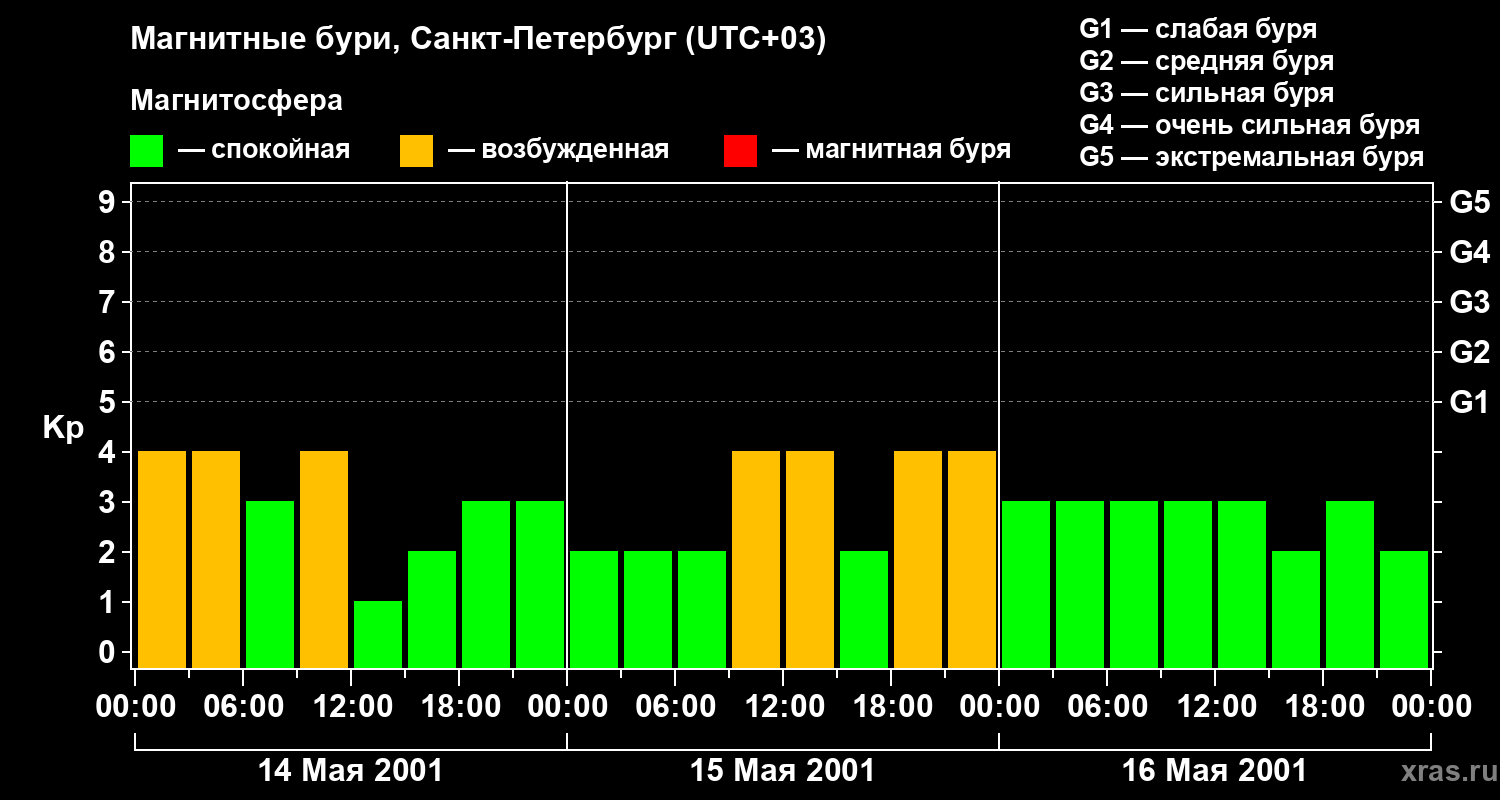 Изменения геомагнитного индекса Kp с 14 по 16 мая 2001 года для средних широт