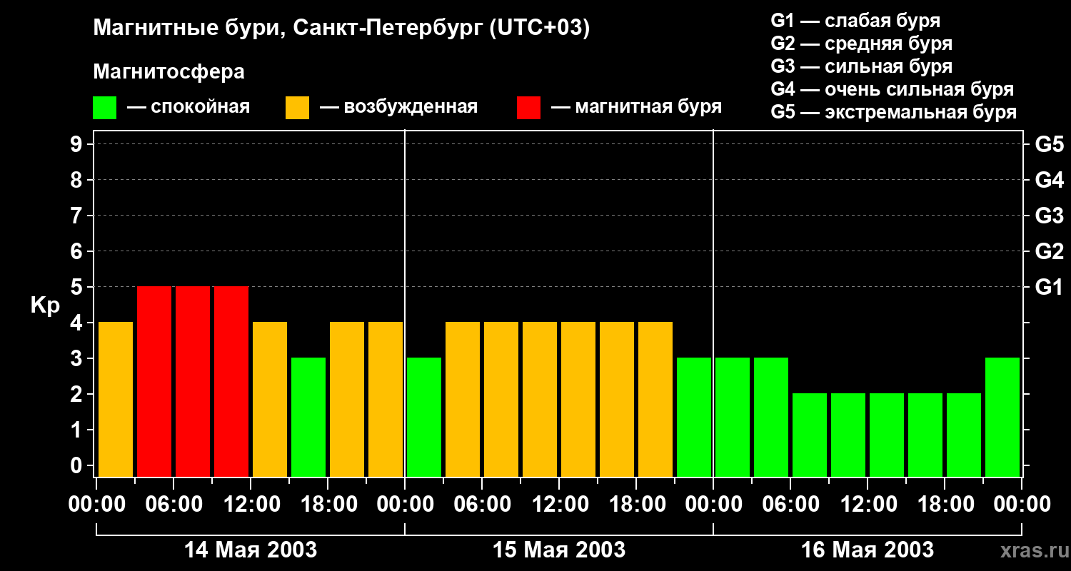 Изменения геомагнитного индекса Kp с 14 по 16 мая 2003 года для средних широт