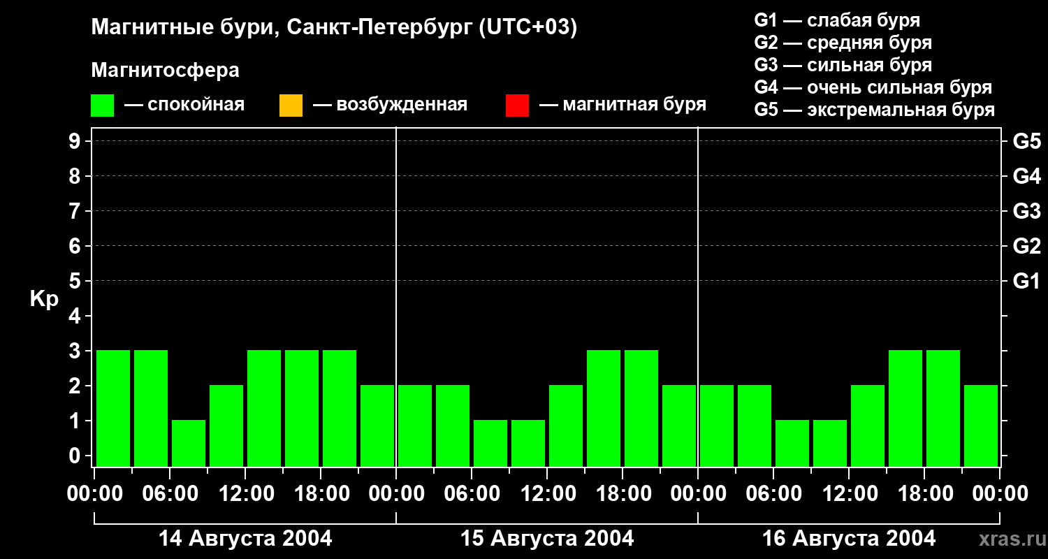 Изменения геомагнитного индекса Kp с 14 по 16 августа 2004 года для средних широт