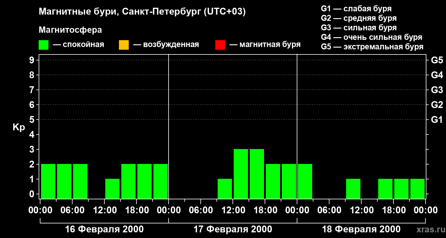Изменения геомагнитного индекса Kp с 16 по 18 февраля 2000 года для средних широт