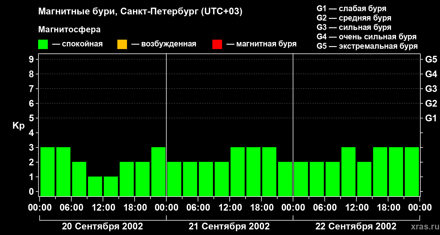 Изменения геомагнитного индекса Kp с 20 по 22 сентября 2002 года для средних широт
