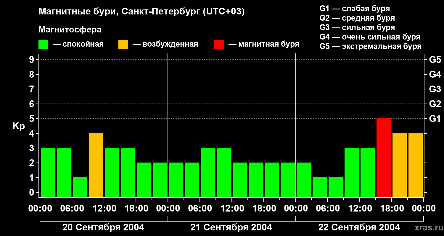 Изменения геомагнитного индекса Kp с 20 по 22 сентября 2004 года для средних широт