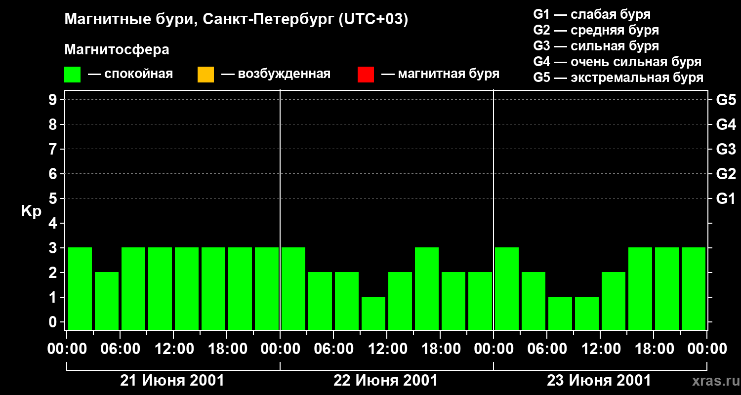 Изменения геомагнитного индекса Kp с 21 по 23 июня 2001 года для средних широт