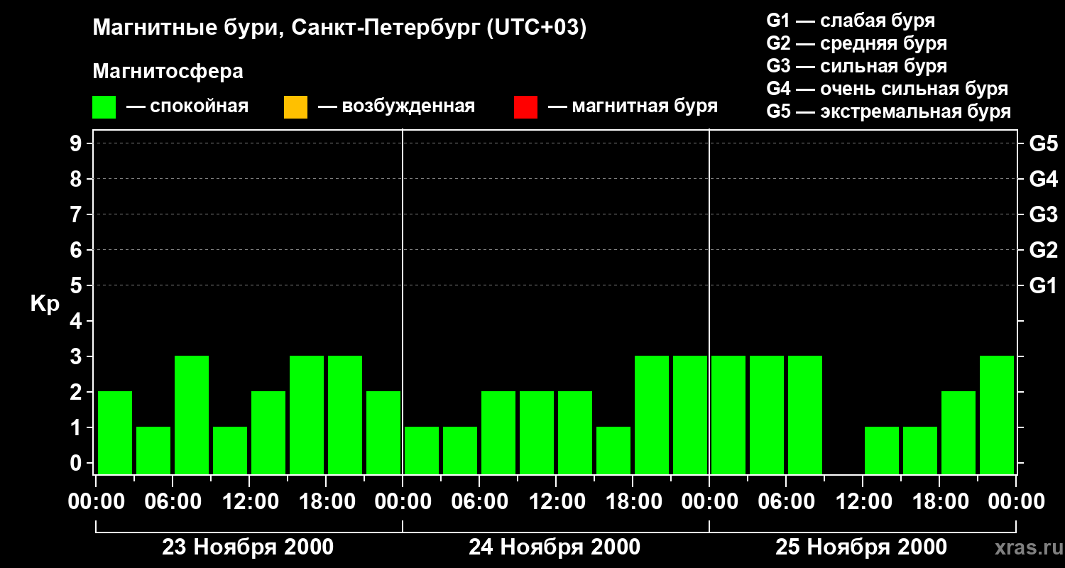 Изменения геомагнитного индекса Kp с 23 по 25 ноября 2000 года для средних широт