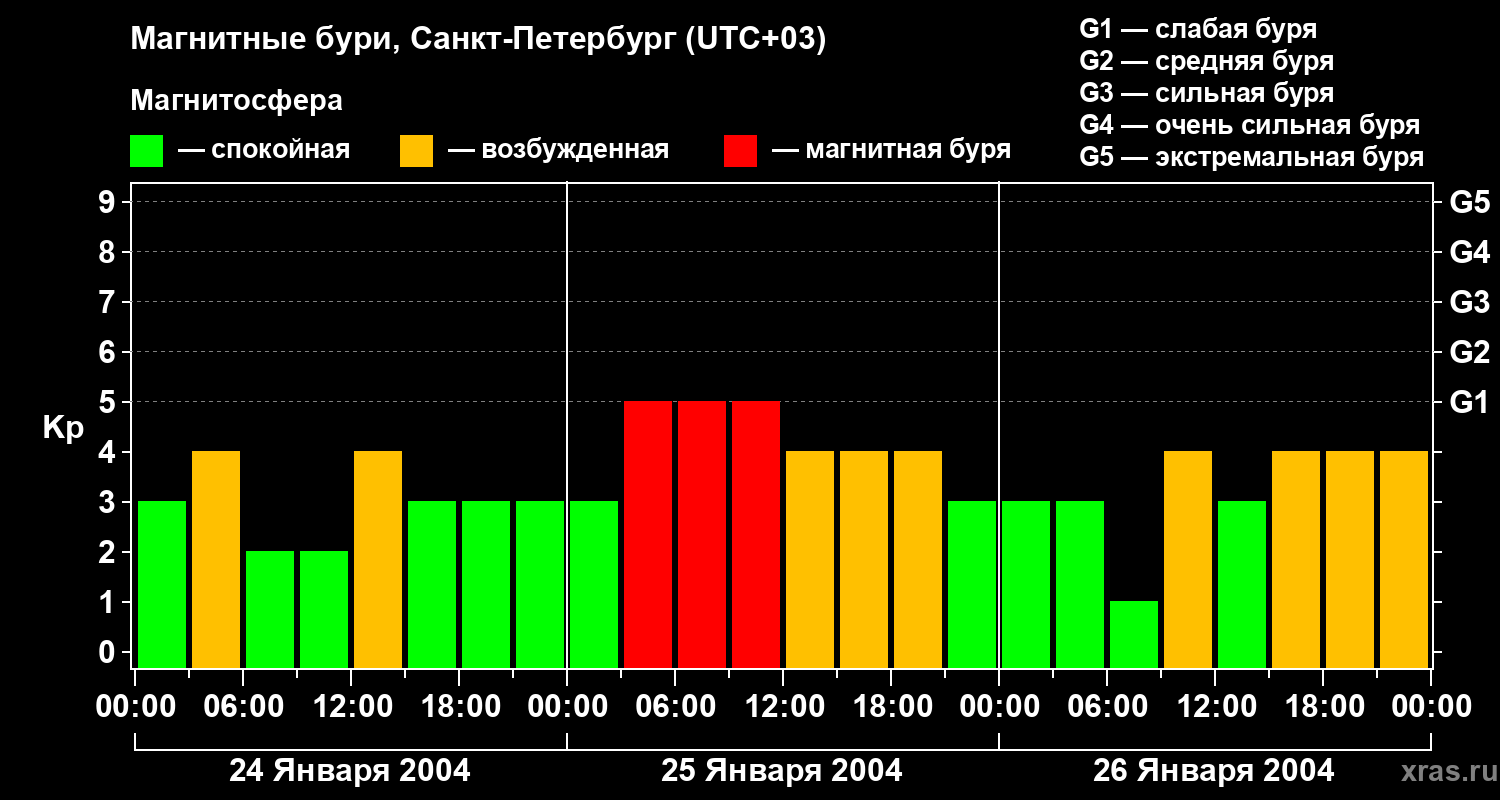 Изменения геомагнитного индекса Kp с 24 по 26 января 2004 года для средних широт