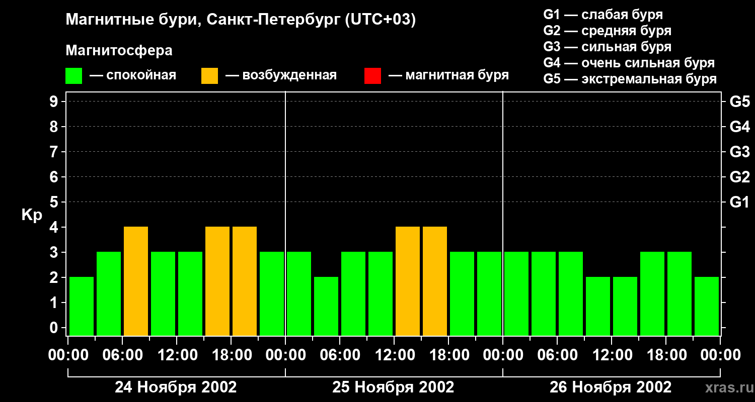 Изменения геомагнитного индекса Kp с 24 по 26 ноября 2002 года для средних широт