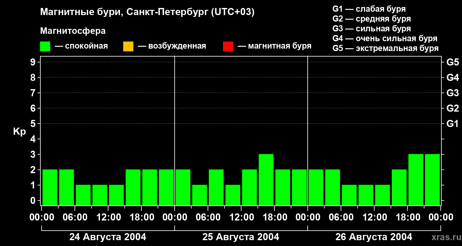 Изменения геомагнитного индекса Kp с 24 по 26 августа 2004 года для средних широт