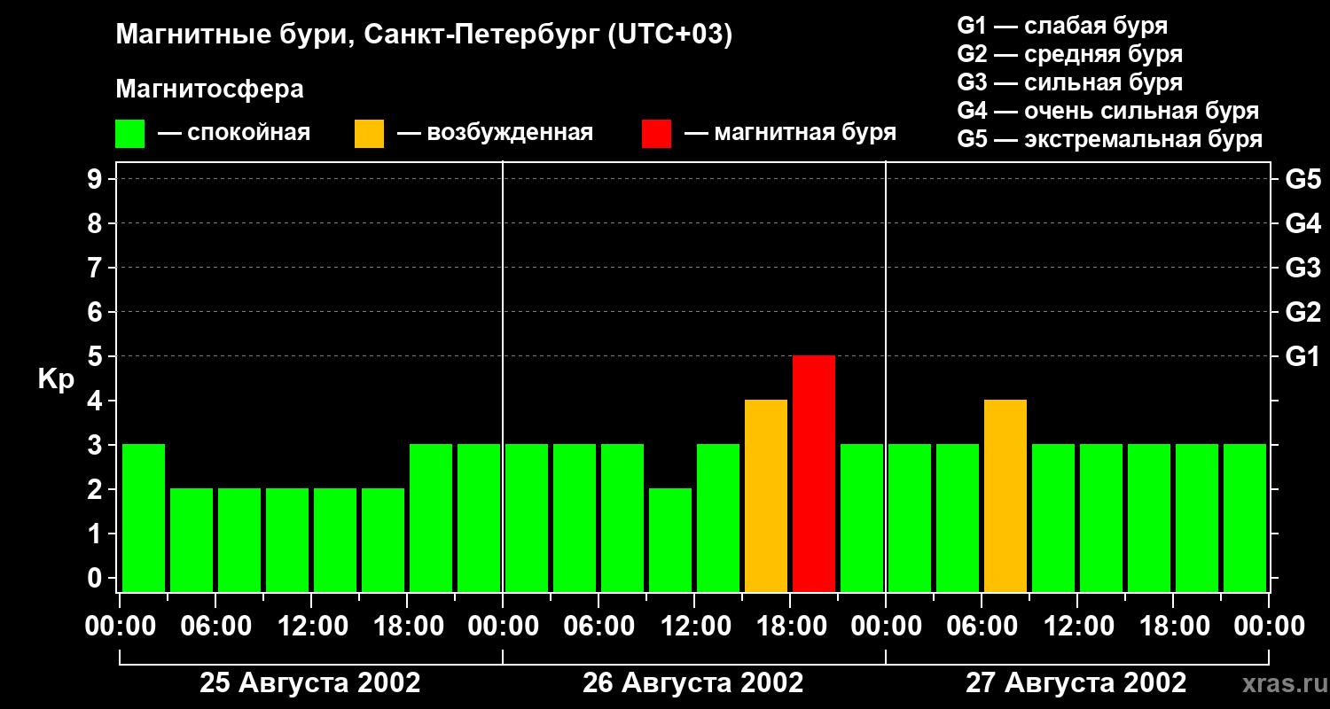 Изменения геомагнитного индекса Kp с 25 по 27 августа 2002 года для средних широт